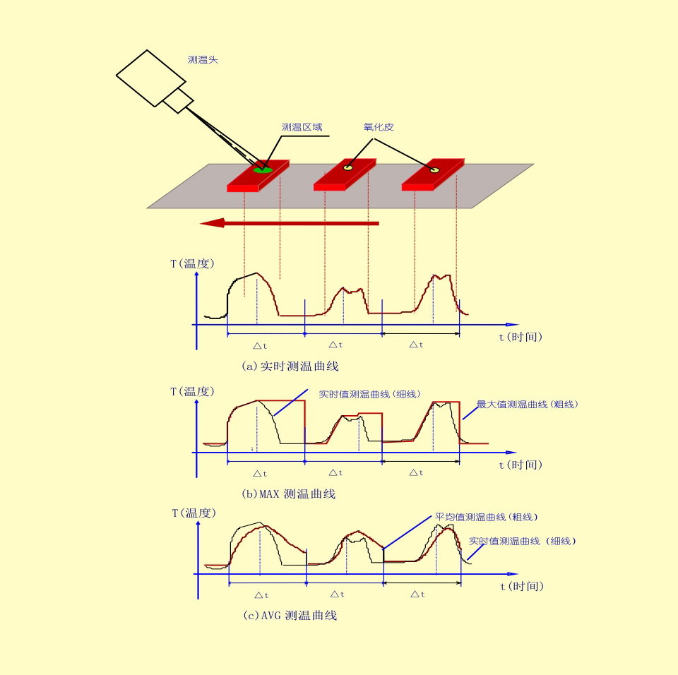 (2)选择**温度方式进行测温,目标在时间间隔△t 之内的**温度值。时间间隔△t 设置范围 1-30 秒,测温曲线如图(b)所示(3)选择平均方式进行测温。显示内容为从△t 起始时刻到当前时刻的平均温度值。时间间隔△t 设置范围 1-30 秒,如图(c)所示。