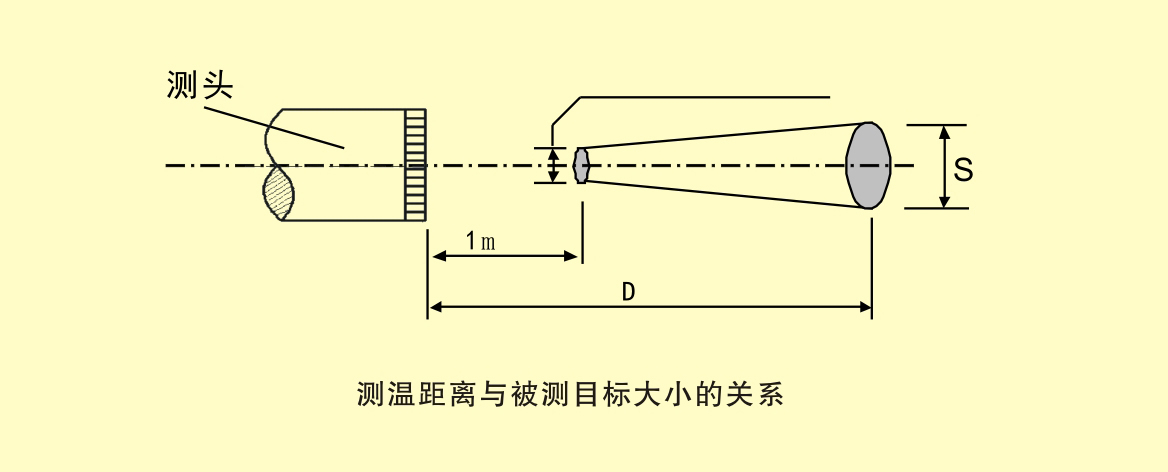 高距离系数,此参数是评价红外测温产品光学分辨率的重要参数,它是一个常数,既它是测量距离 D 与被测区域直径 S 之比值。